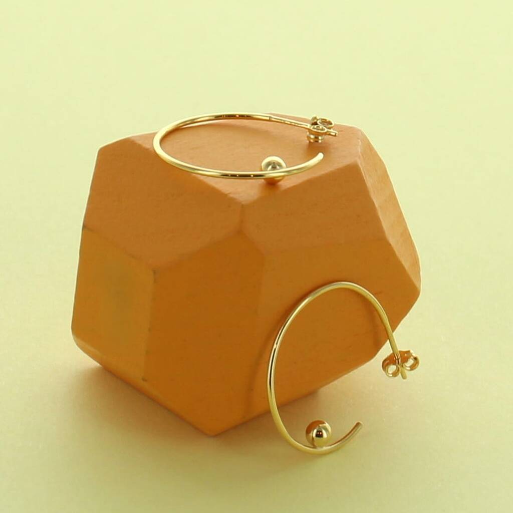 A stunning par of simple gold plated sterling silver hoop earrings accented with a ball at the end of the hoop.Elevate your everyday style with these minimalist hoop earrings featuring a single polished ball detail. Sleek, lightweight, and versatile, they add a subtle yet sophisticated touch to any outfit, perfect for both casual and formal looks.