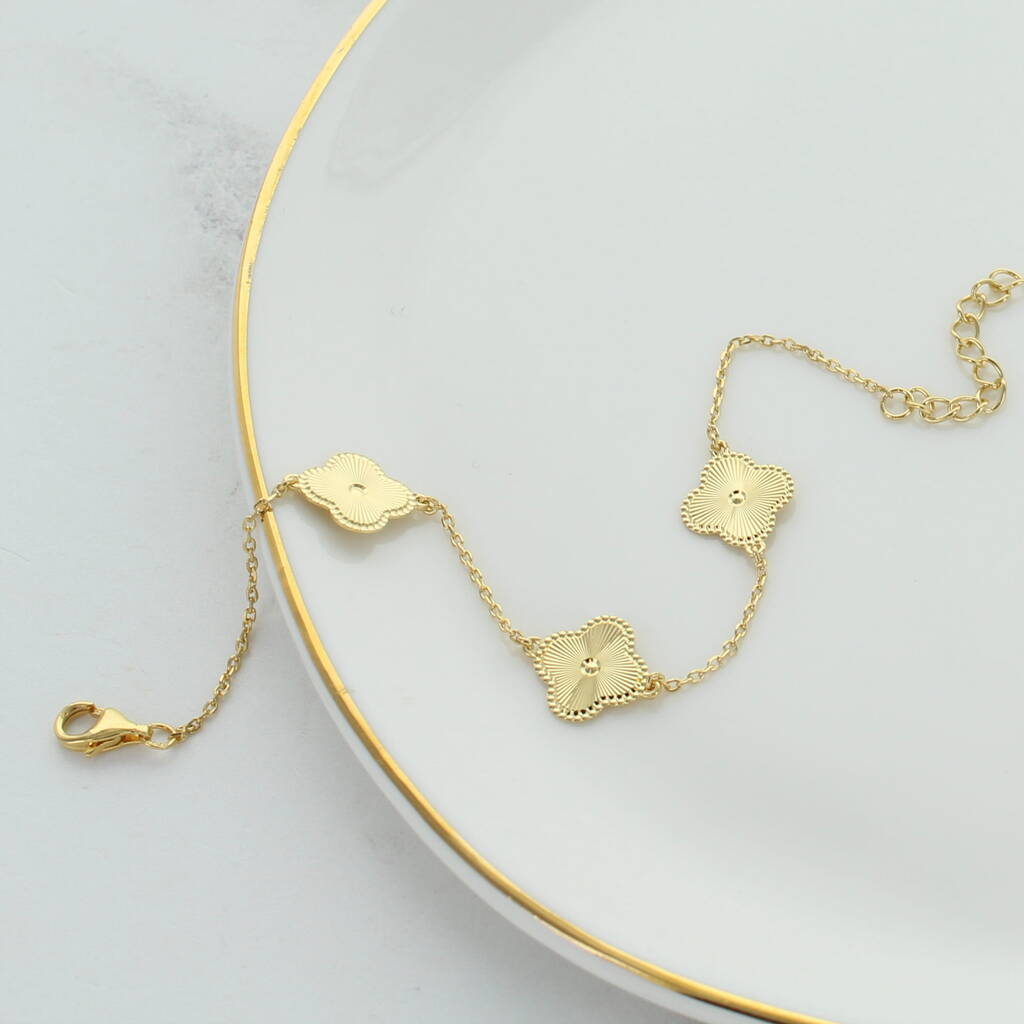 Featuring three intricately designed clover-shaped flowers, each symbolizing luck, love, and harmony, this bracelet is perfect for daily wear or special occasions. Its lightweight and adjustable chain ensures a comfortable fit for any wrist.