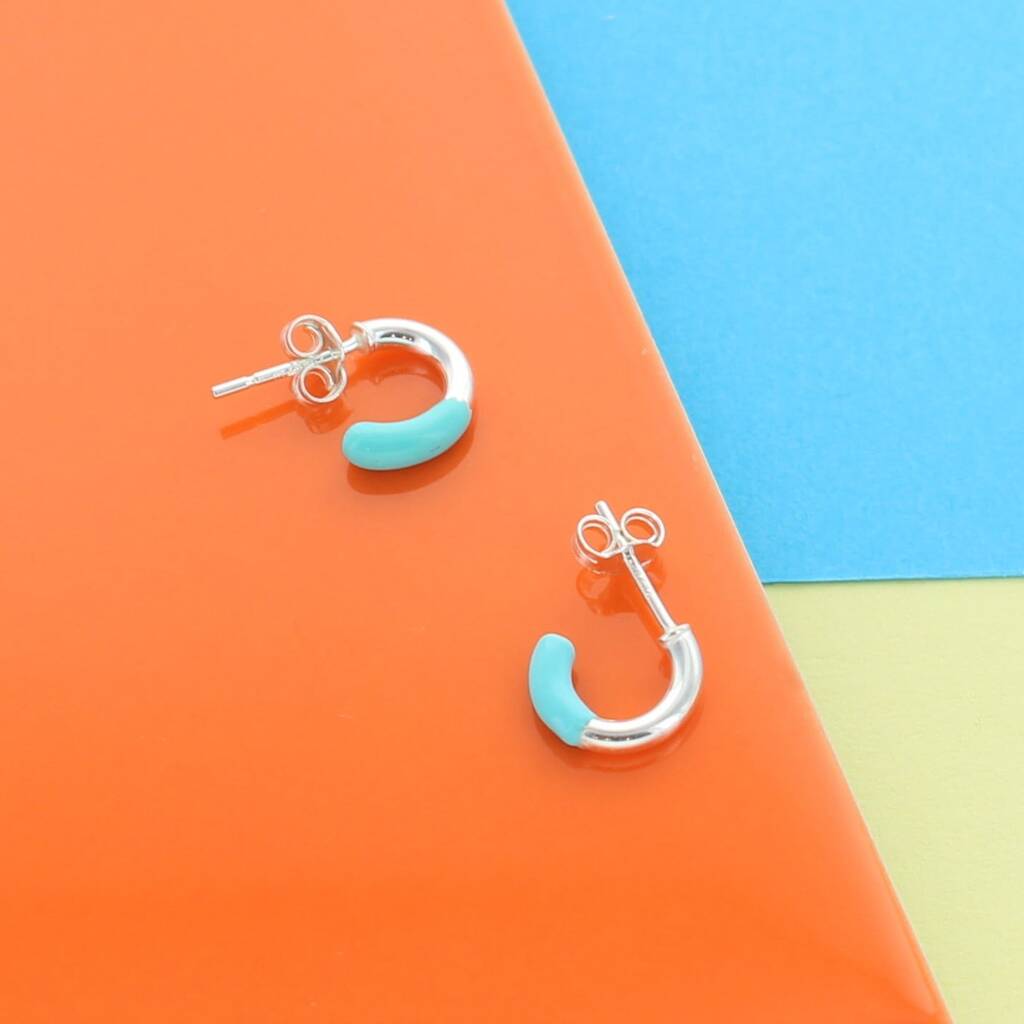 A fabulous pair of dainty sterling silver and Turquoise enamel dipped earringsCrafted for everyday elegance and effortless style, these petite hoop earrings are made from 925 sterling silver with a rich Turquoise enamel finish that adds a vibrant yet sophisticated pop of colour. The enamel coating is smooth and glossy, creating a striking contrast against the polished silver that frames it. These Turquoise enamel hoops make a lovely gift and are ideal for adding a refined splash of colour to any jewellery collection A free gift wrapping service is available upon request.