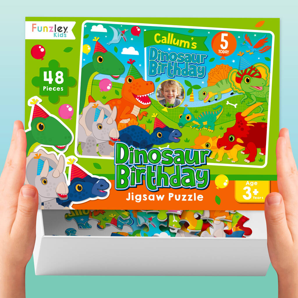 Personalised Dinosaur Birthday Jigsaw, featuring your child’s name, age and photo, presented with a matching personalised lid.