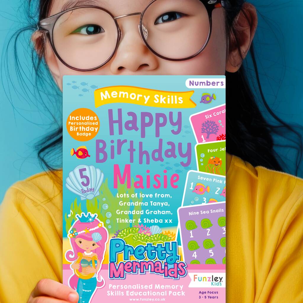 Personalised Pretty Mermaids Memory Number Skills Flashcards, featuring your child’s name, age and photo, presented inside a matching personalised gift box.