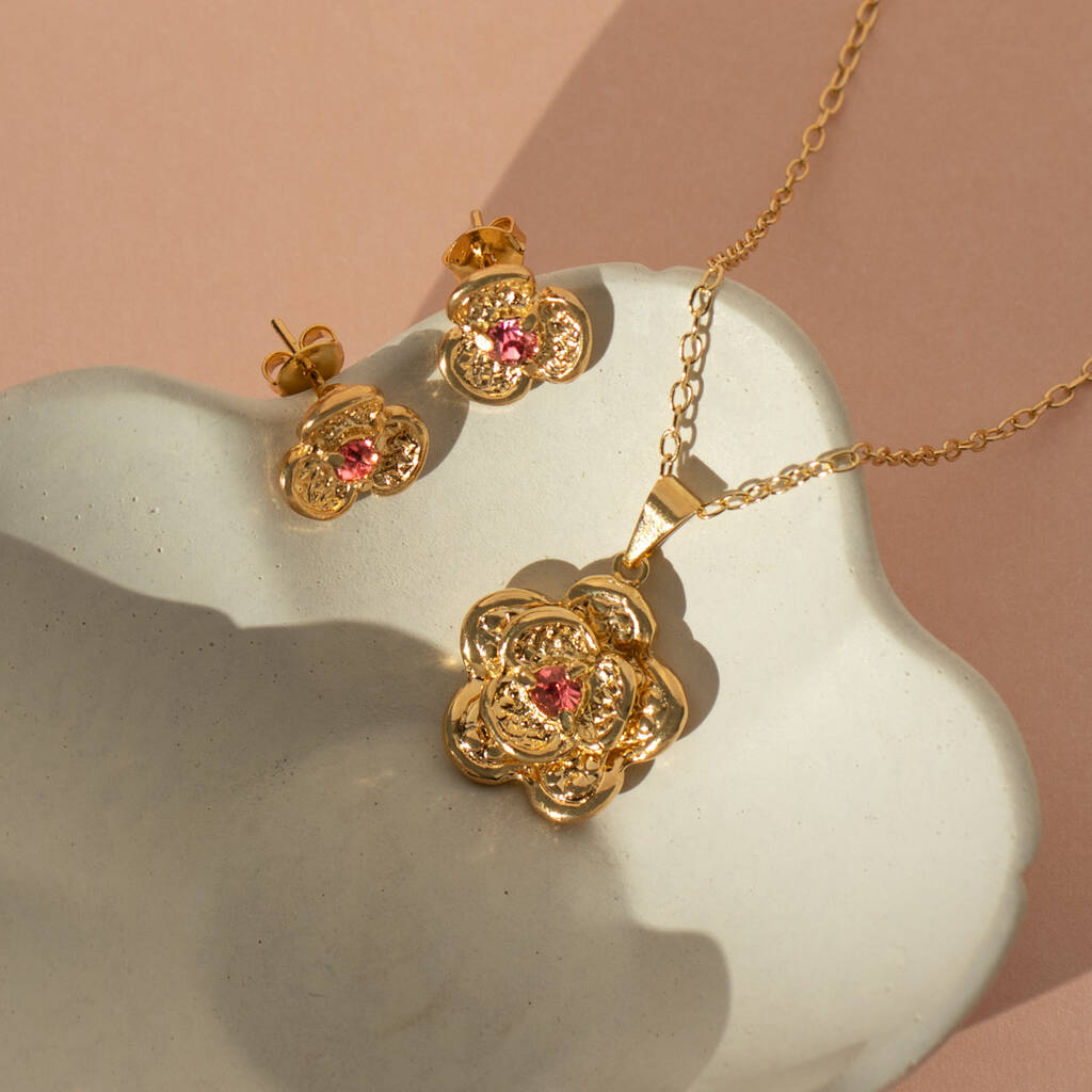 Flower And Pink Crystal Necklace And Earrings Set
