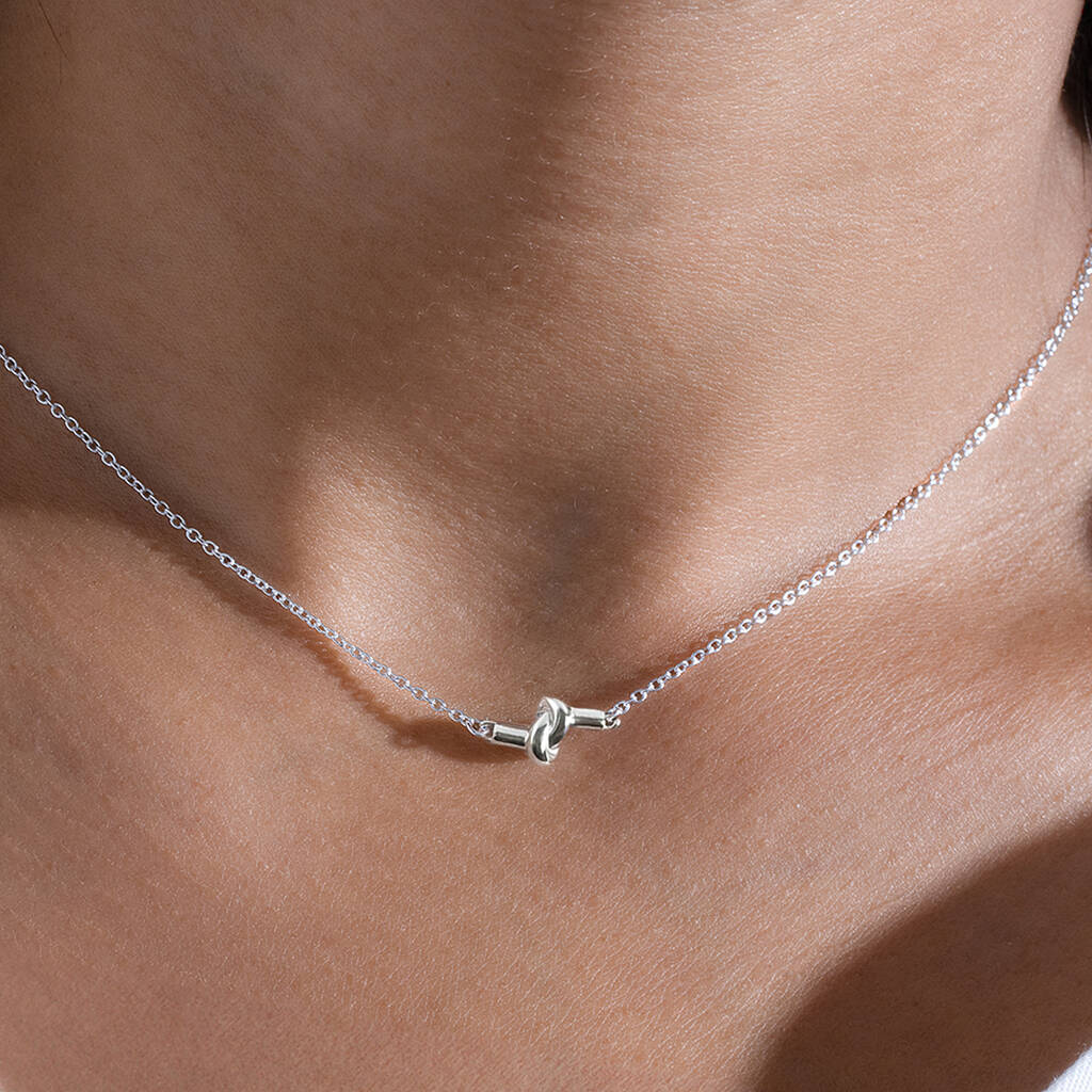 Made from sterling silver, the necklace hangs from a strong belcher chain for durability and comfort. The knot is smooth and polished, catching light softly without feeling showy. With a 41cm chain and a 4cm extension, it sits neatly at the collarbone and can be adjusted to suit different necklines. Easy to wear and easy to gift, it carries a message of connection for any occasion.