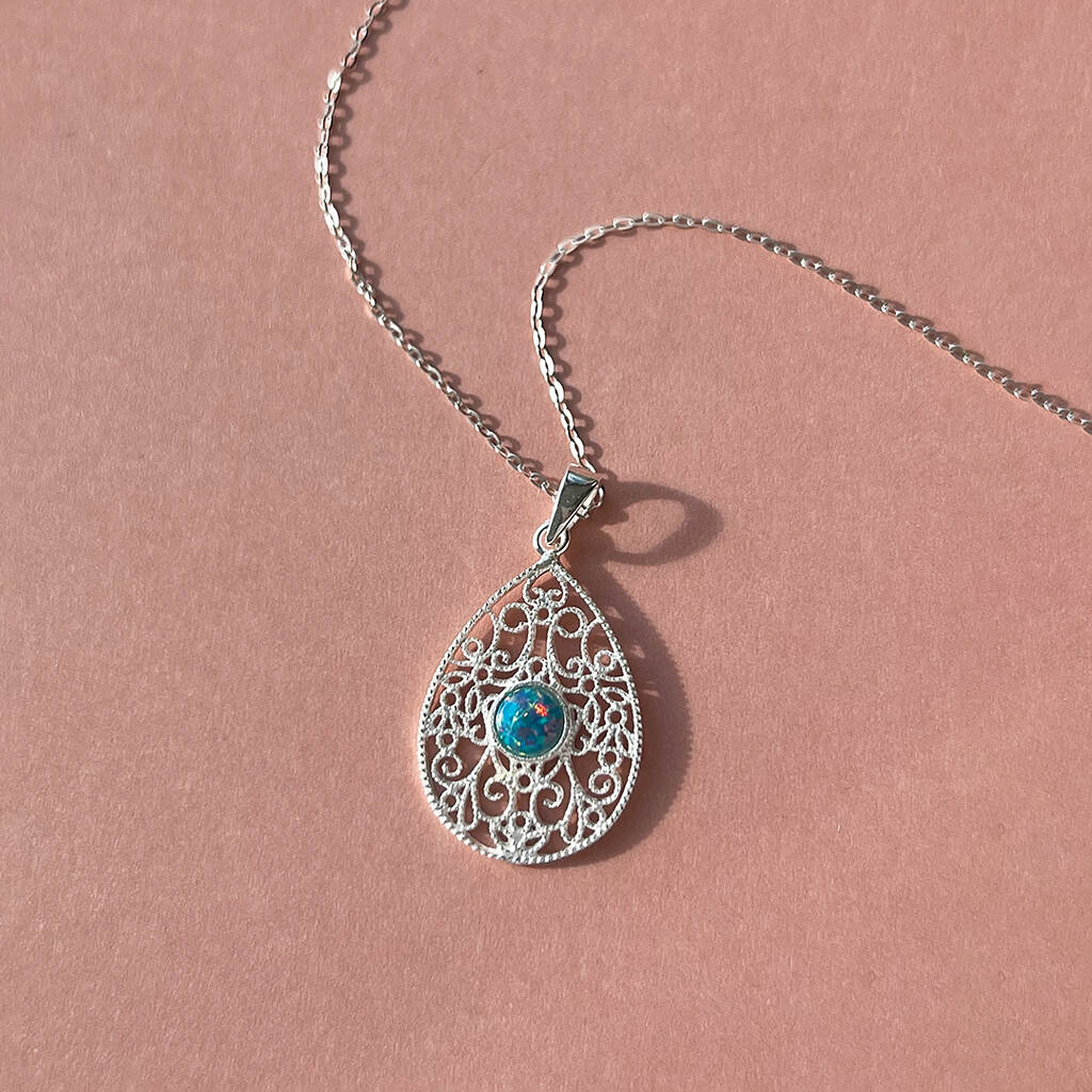 Sterling Silver Opal Filigree Teardrop Necklace