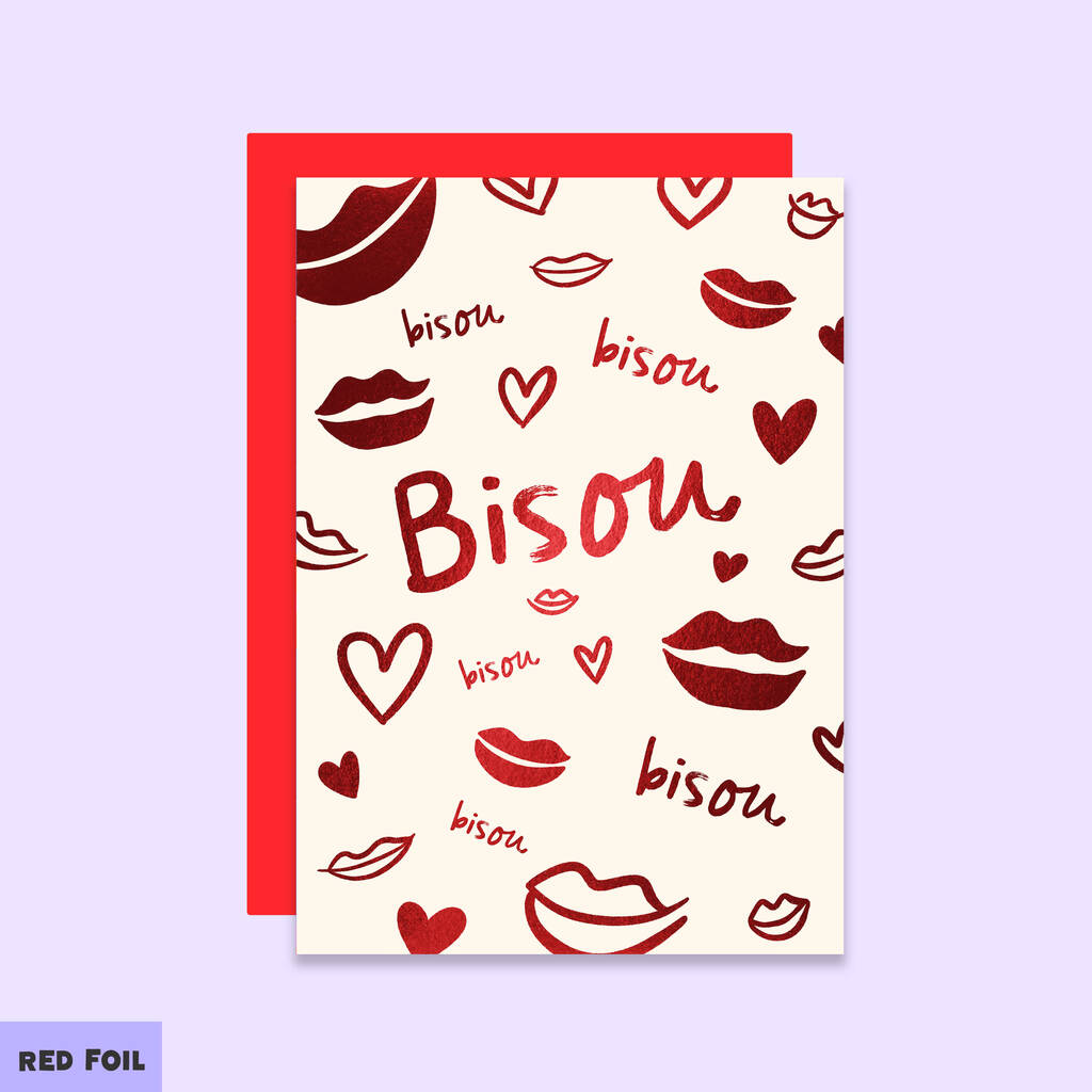 Send a flurry of kisses with this playful design featuring "Bisou" (French for kiss) in luxurious red foil.