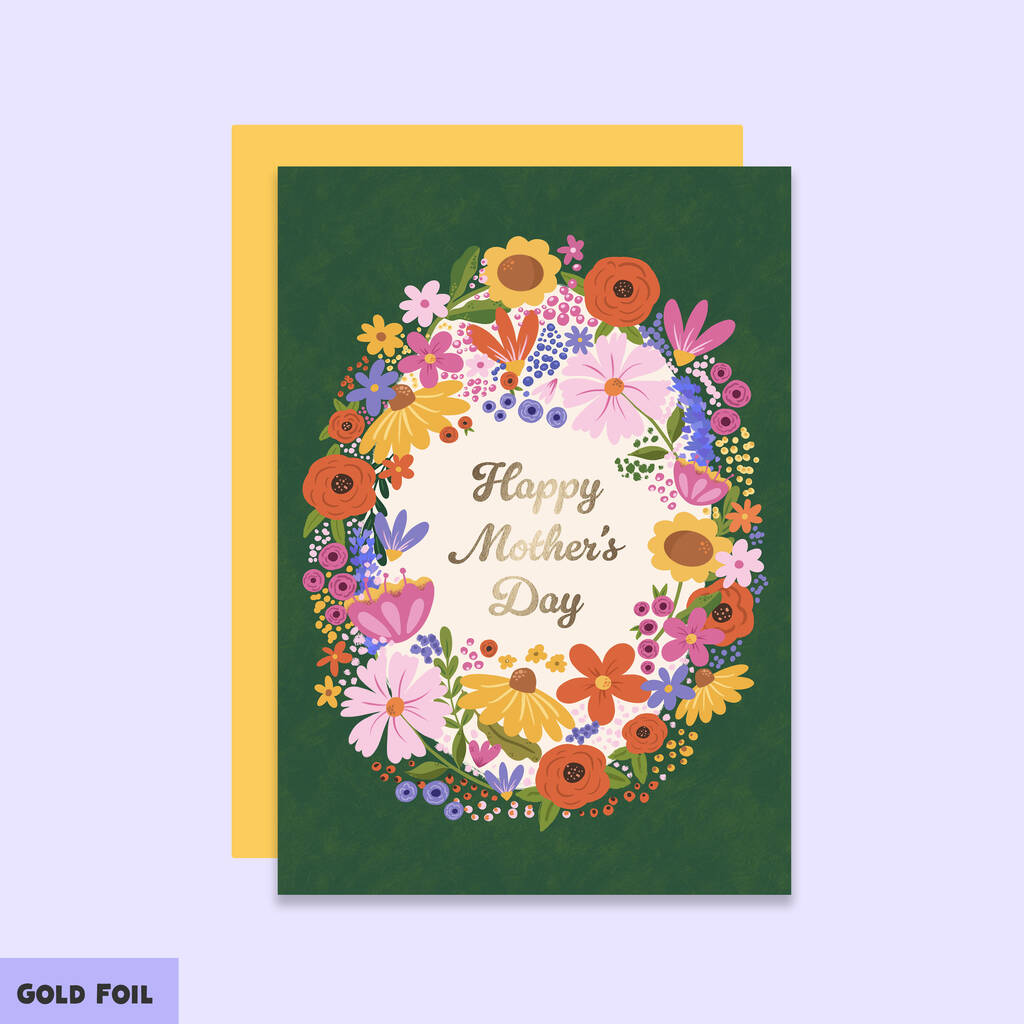 A pretty flower wreath card for Mother's day finished with luxury gold foil