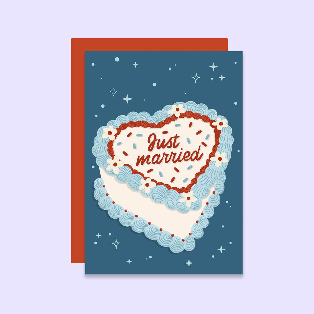 The vintage-inspired design features a charming heart-shaped wedding cake illustration that captures all the joy and romance of classic wedding celebrations