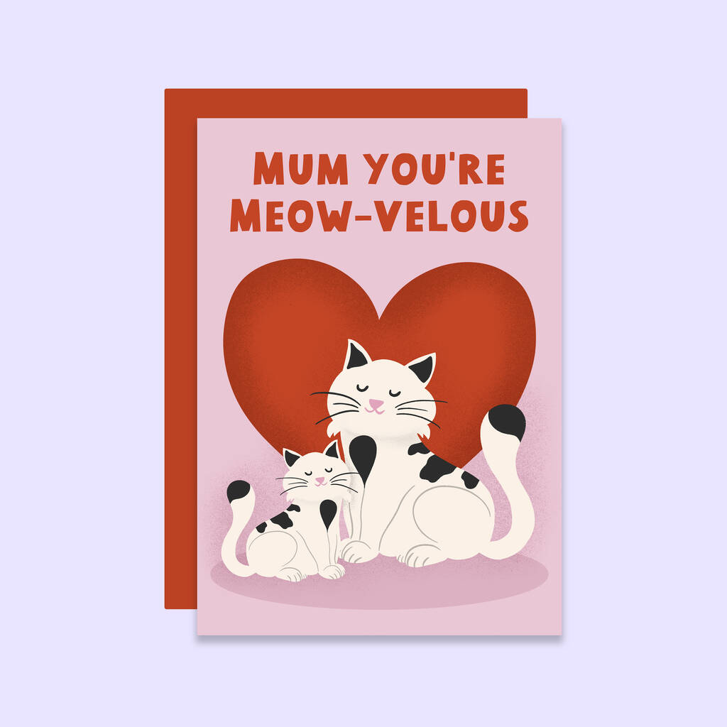 The heartwarming design features a baby cat cuddled up close with mum cat, both nestled against a bold red heart on a soft pink background