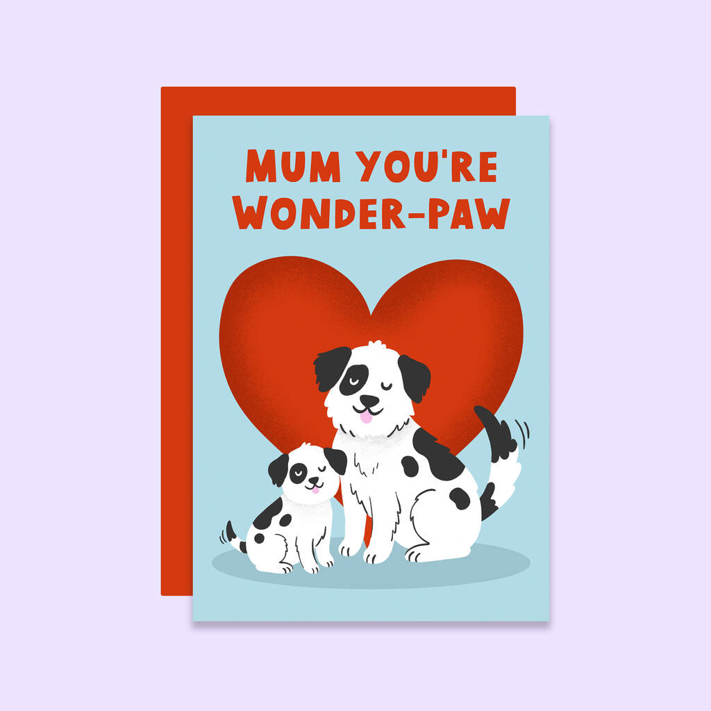 The playful caption "Mum You're Wonder-Paw" delivers the perfect mix of cuteness and affection that dog-loving mums everywhere will adore