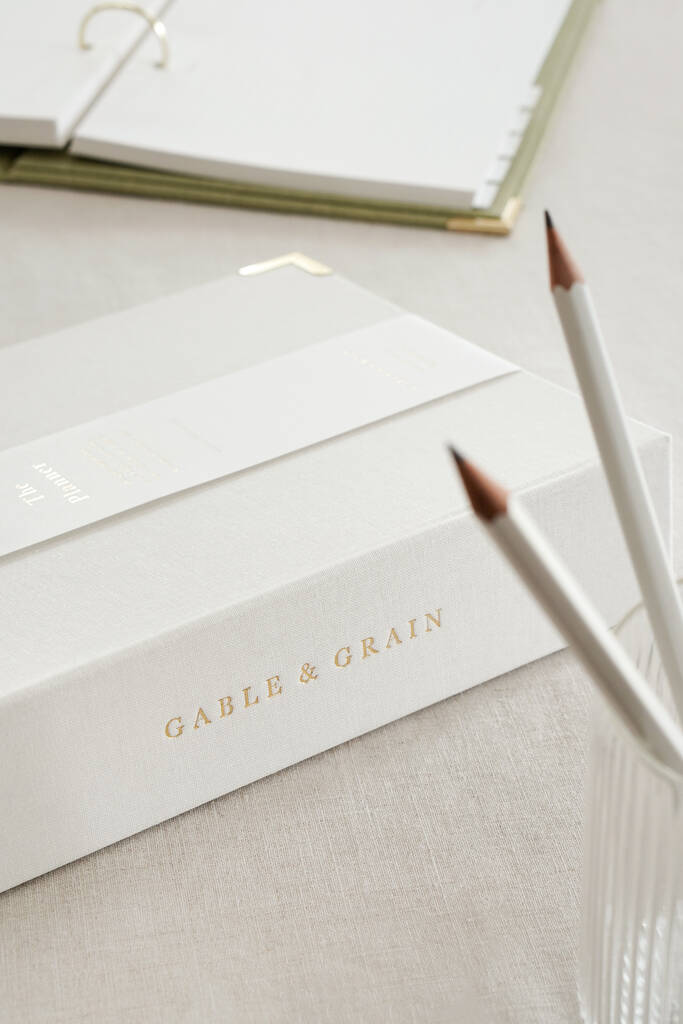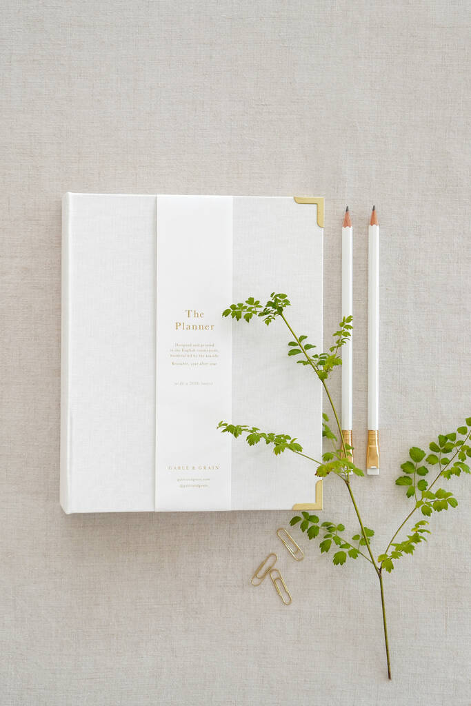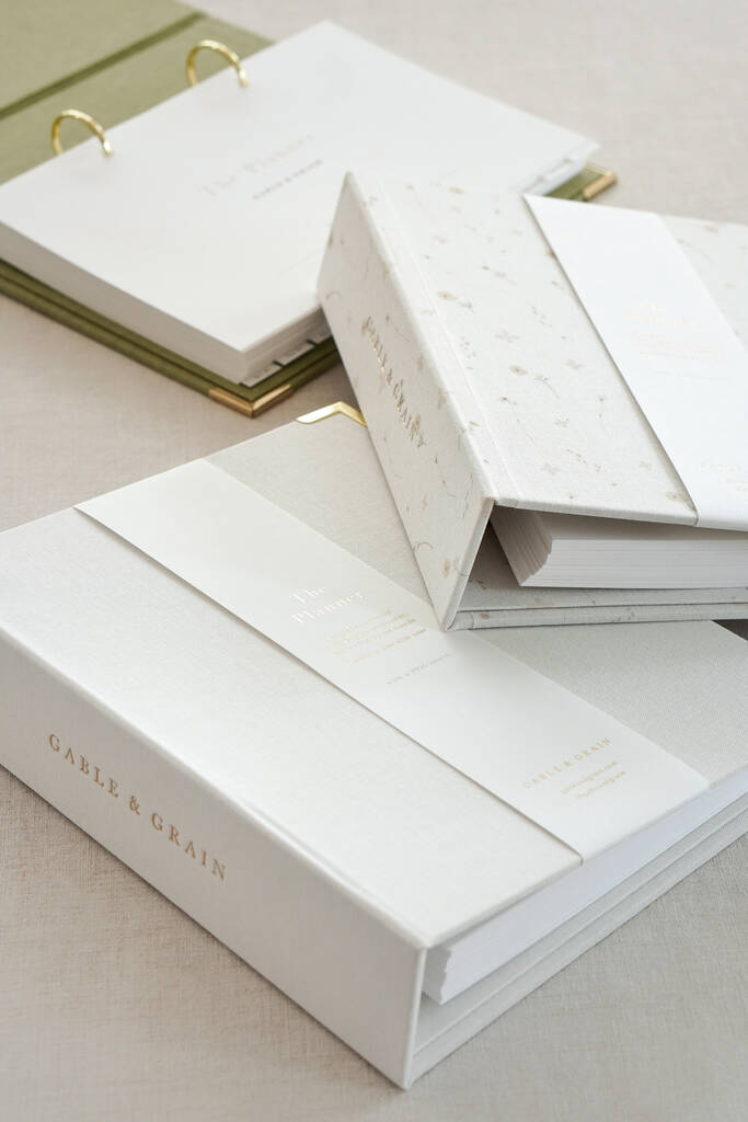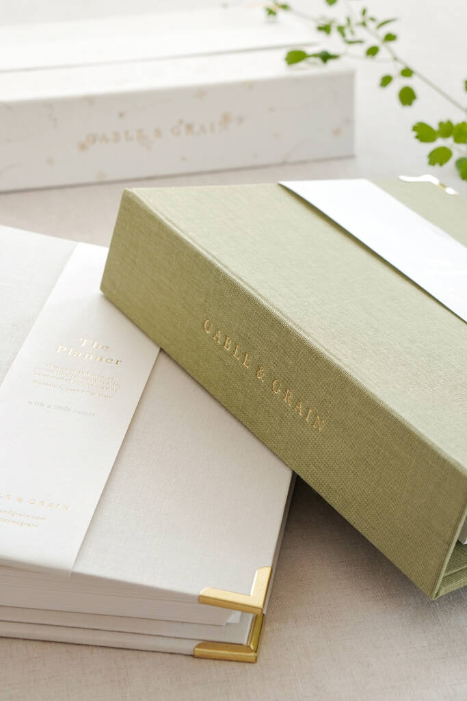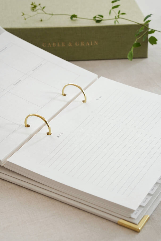 The Planner:A woven cotton book cloth coverMetal ring binder mechanism and protective corners in a gold colourGold foil blocked detailsSize: W18.7 x H22.8 x D5.2cmHandcrafted by the English seasideAvailable in a sage green or soft white