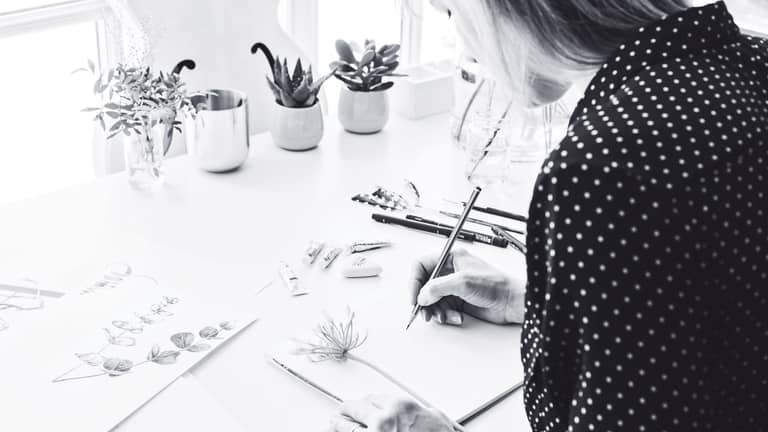 Starkeys Lane was founded by artist and illustrator Gail Jones. Gail works from her studio in Buckinghamshire designing and illustrating art prints, luxury cards and stationery. Inspired by nature, Gail illustrates using a variety of mediums and digital design to produce contemporary artwork. Her desk is usually full of flowers, plants and anything she finds in her natural surroundings!
