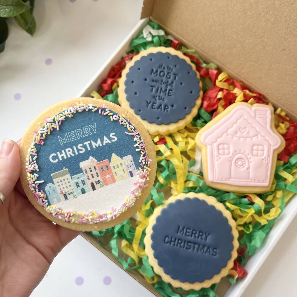 Box of 4 delicious Christmas theme iced shortbread cookies, in our newest Christmas Houses theme.