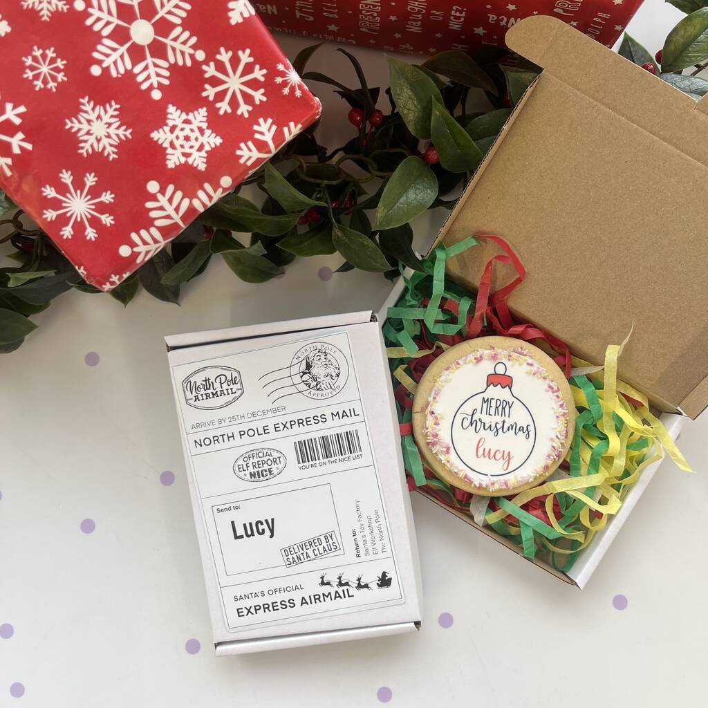 You've got Santa mail! Personalised Christmas bauble cookie with a custom delivered by Santa mail postage box.