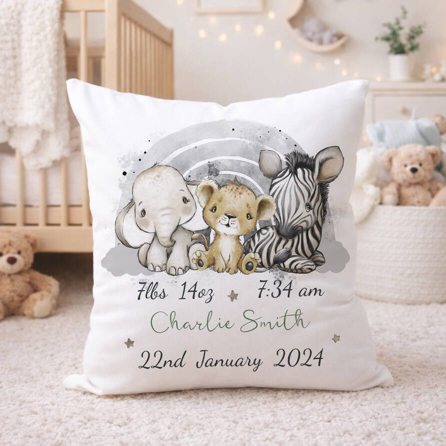 Children Personalised Safari Theme Birth Details Printed Cushion