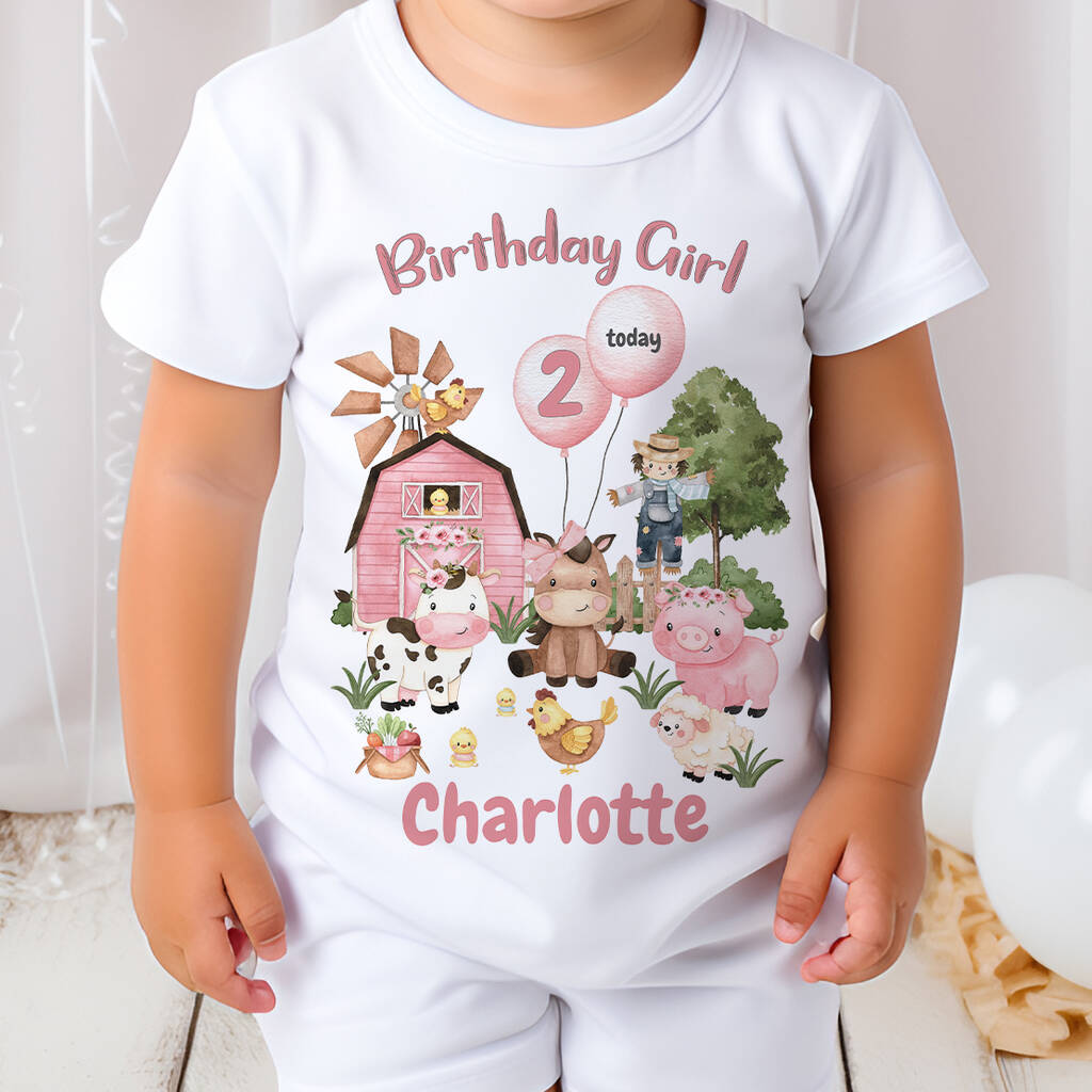 Girls Personalised Pink Farm Animals Birthday T Shirt