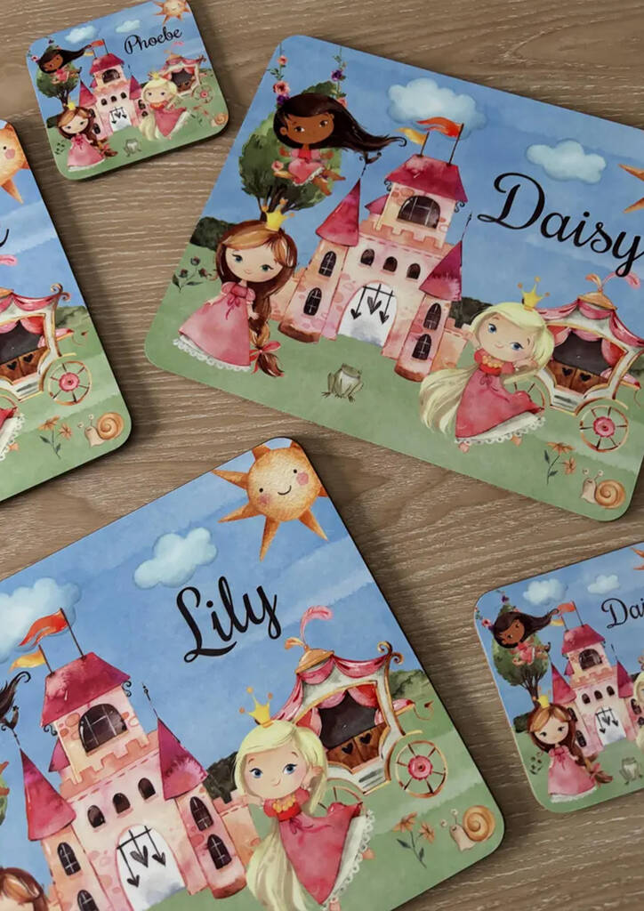 Kids Personalised Princess Placemat, Coaster And Mug Dinner Set