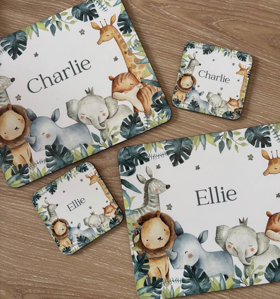 Kids Personalised Safari Theme Placemat, Coaster And Mug Dinner Set