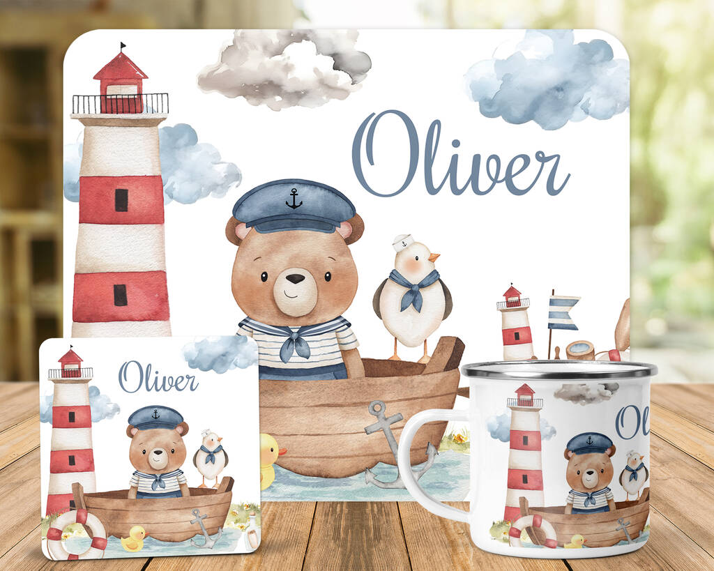 Kids Personalised Sailor Teddy Bear Placemat, Coaster And Mug Dinner Set