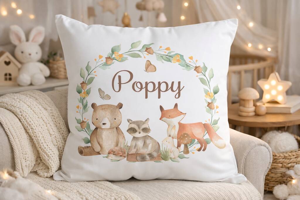 Kids Personalised Woodland Animals Name Printed Cushion