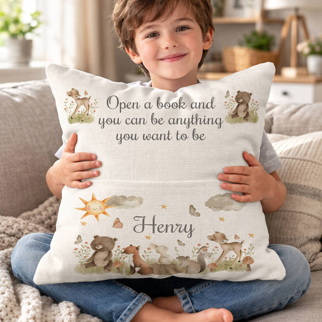 Personalised Woodland Pocket Pillow Cushion, Kids Reading Nook Decor