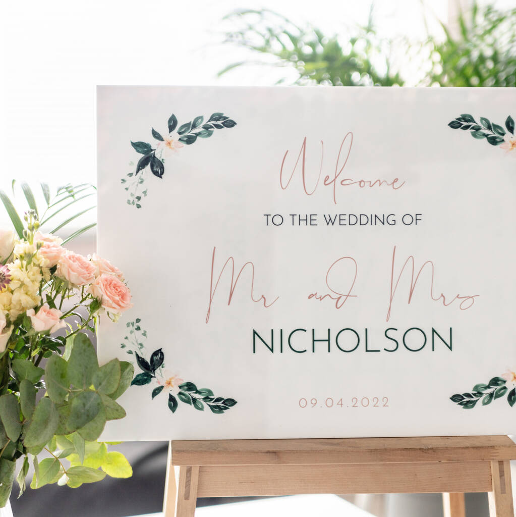 Floral Garland Wedding Welcome Sign In White Acrylic