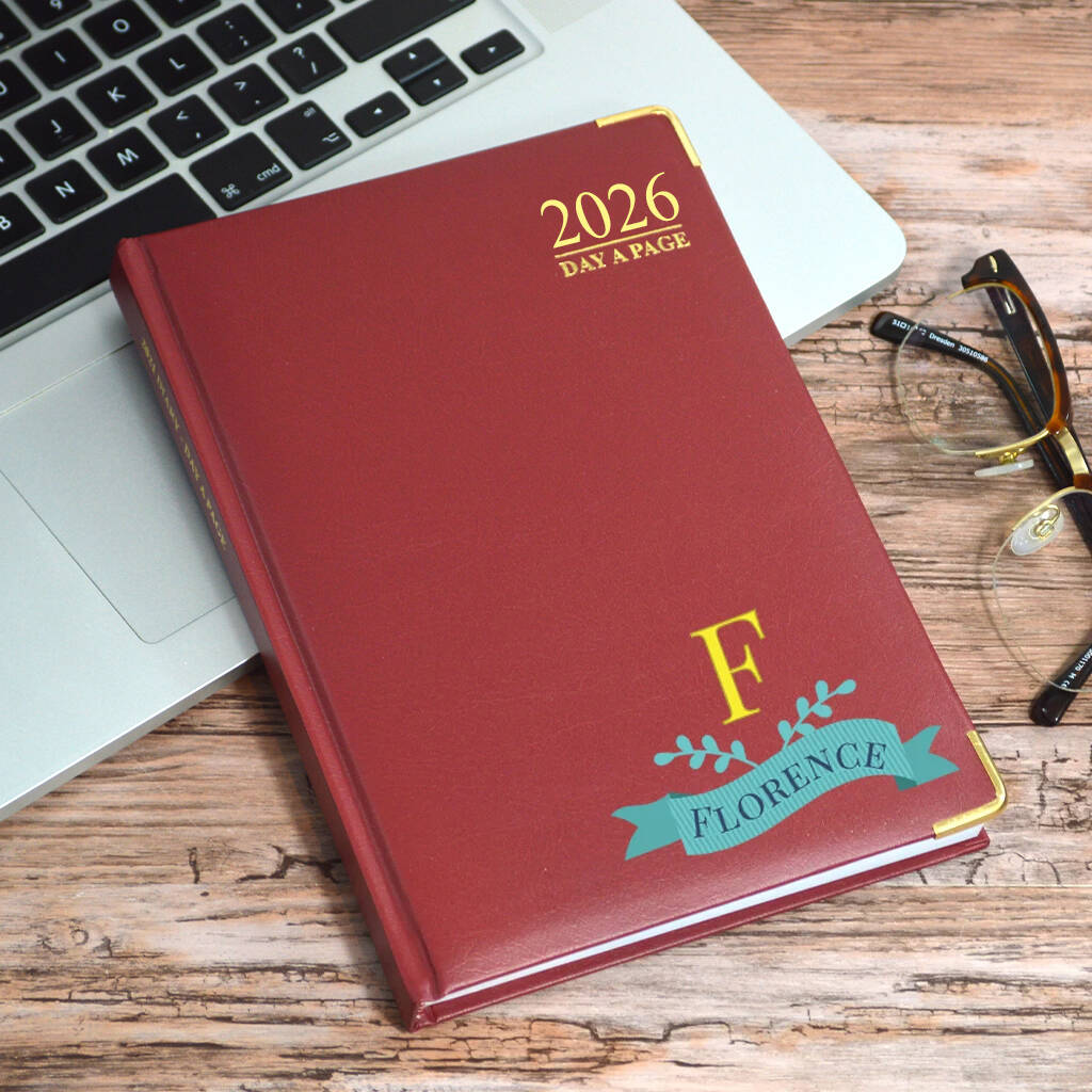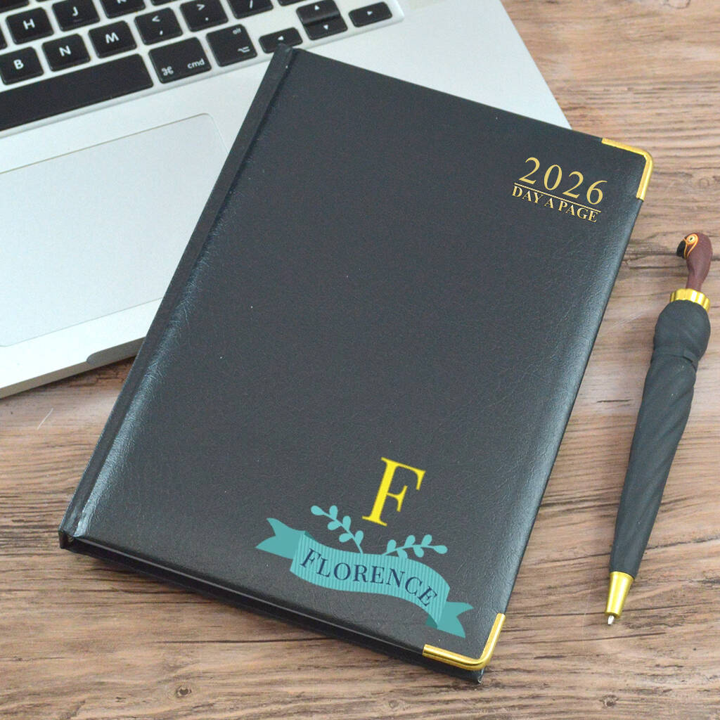 A stylish personalised diary for 2026, featuring a ribbon banner design with printed initial and name. A thoughtful, modern gift for everyday organisation.