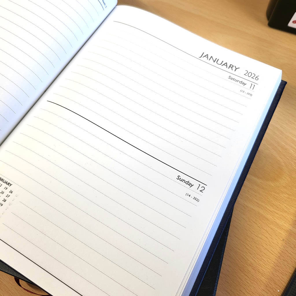 Available in A5 or A4 sizes (A4 +£4.00) and finished in Black, Blue or Red padded hardback covers.