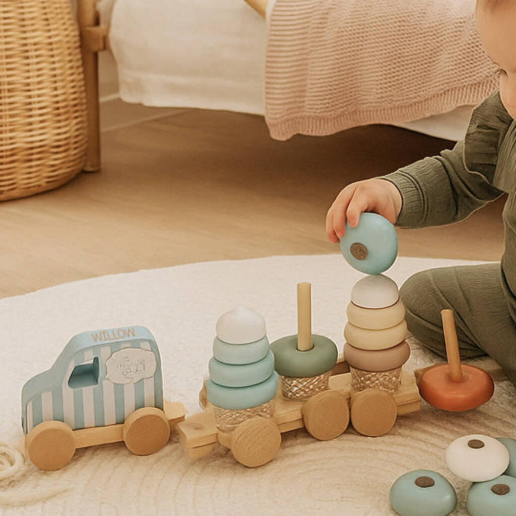 If you’re looking for a toy that’s fun, beautiful, and built to engage a child’s imagination, this Personalised Stacking Ice Cream Truck Toy is sure to bring joy, and maybe a little sweetness, to every day. Turn snack time into a whimsical playtime treat! Perfect for toddlers aged 18 months and up, this charming wooden toy blends open-ended play with creative fun—stack, build, pull around, and imagine your ice cream business on wheels!