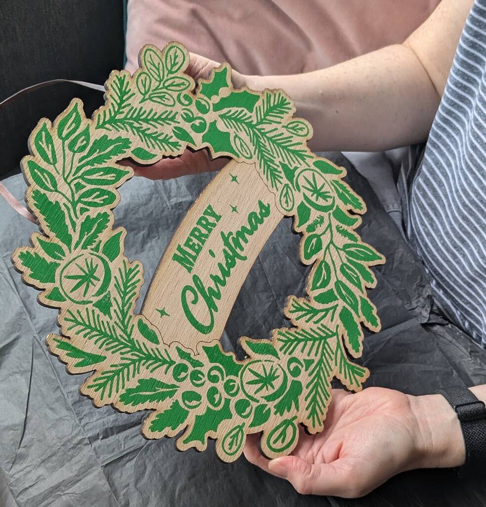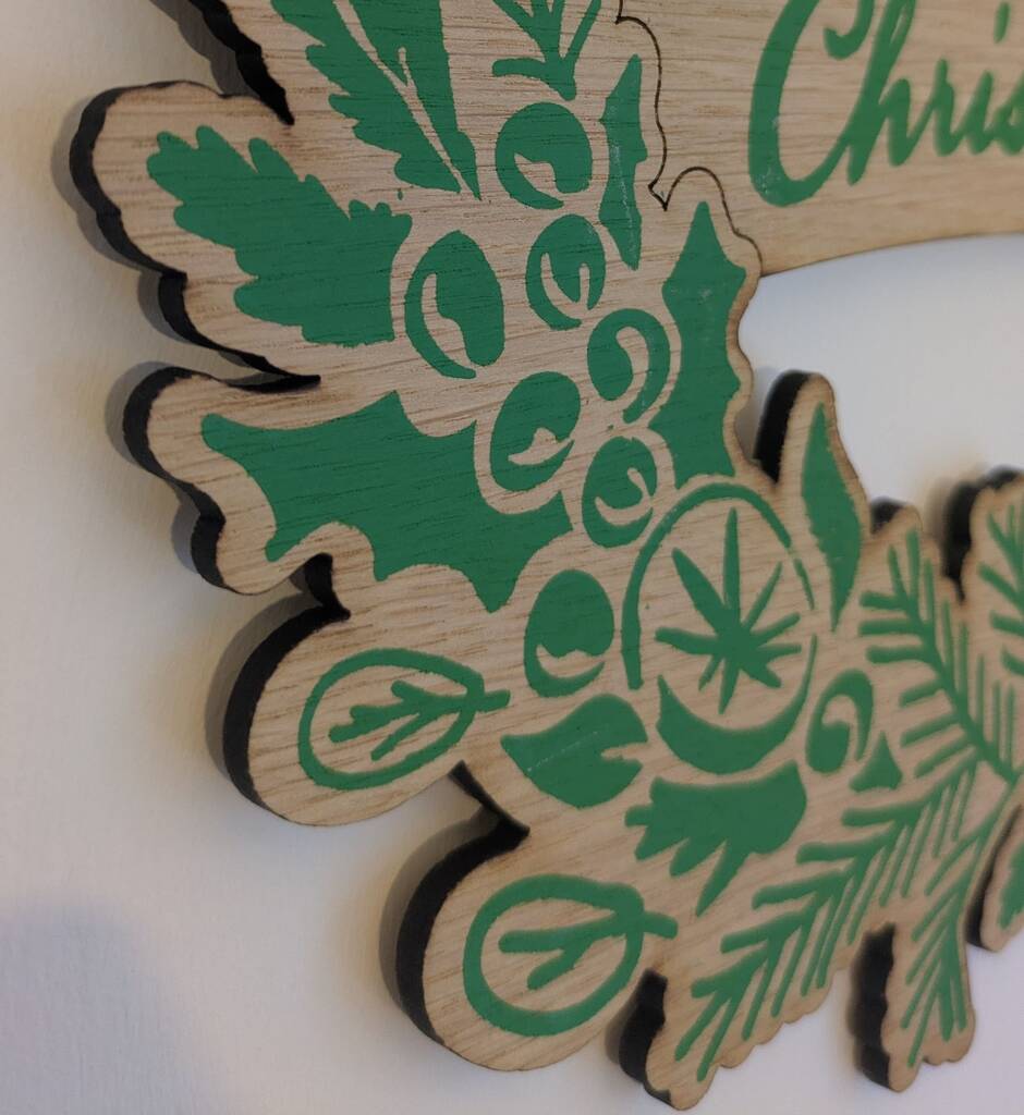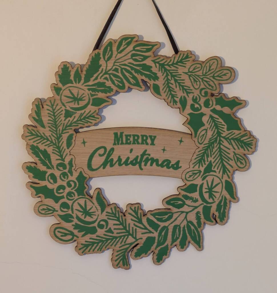 It is a quality item made from 4mm thick oak veneer wood luxuriously screen printed in a vibrant green complete with a leather hanging strap ready to adorn your wall this Christmas.
