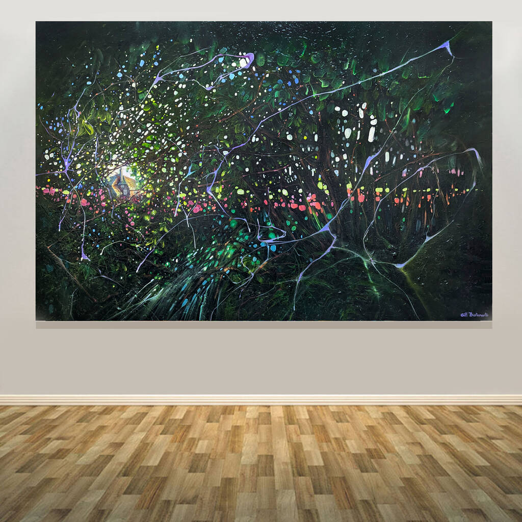 Dissolving Dream is a large textured abstract landscape oil painting about frustration and hope. It is 47x31x2 inches. The painting shows a dream house glimpsed through dark tangled trees. It is heavily textured in a dark iridescent green background. At first glance, it is completely abstract with lines and curves and spots of bright colour directing the eye around the painting. In one small section to the left, you can see an old English house with bright sunlight illuminating one side of it. There is also the hint of a stream and a field or flowers beyond. The painting represents a long-term dream of mine to live in a beautiful house in the countryside. I suspect the ship may have sailed on that dream so that is why it is both a hopeful painting and a wistful one. Painted on deep edge canvas, edges painted to match, ready to hang and comes with certificate of authenticity. https://youtu.be/TOuPEQGHC_A