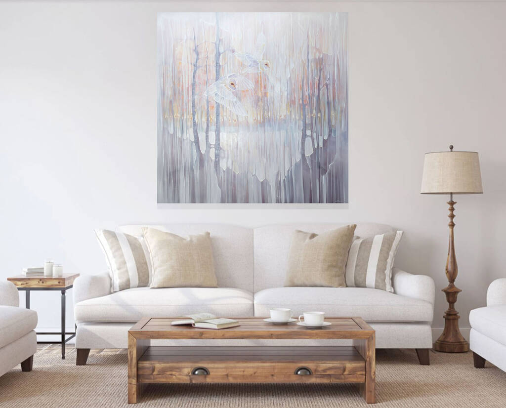 Out Of This World is a white, neutral toned, magical realism painting with barn owls and deer. It is 48x48x1.5 inches. The painting shows two transparent barn owls gliding through a woodland clearing with rows of deer observing them from beneath the trees. There is a hint of a lake and snow and the colour is predominately white with pale peach, gold, blues and lilacs. The inspiration was the feeling I get sometimes when entering a woodland and the atmosphere changes – as if nature holds her breath whilst I trespass though her domain. At the same time, I often spot deer staring at me and the birds stop singing which further enhances the idea that I have stumbled into another universe and am welcome only as long as I don’t hang around too long… Painted on deep edge canvas, white edges, ready to hang and comes with certificate of authenticity. https://youtube.com/shorts/WdBGauP5JA0?