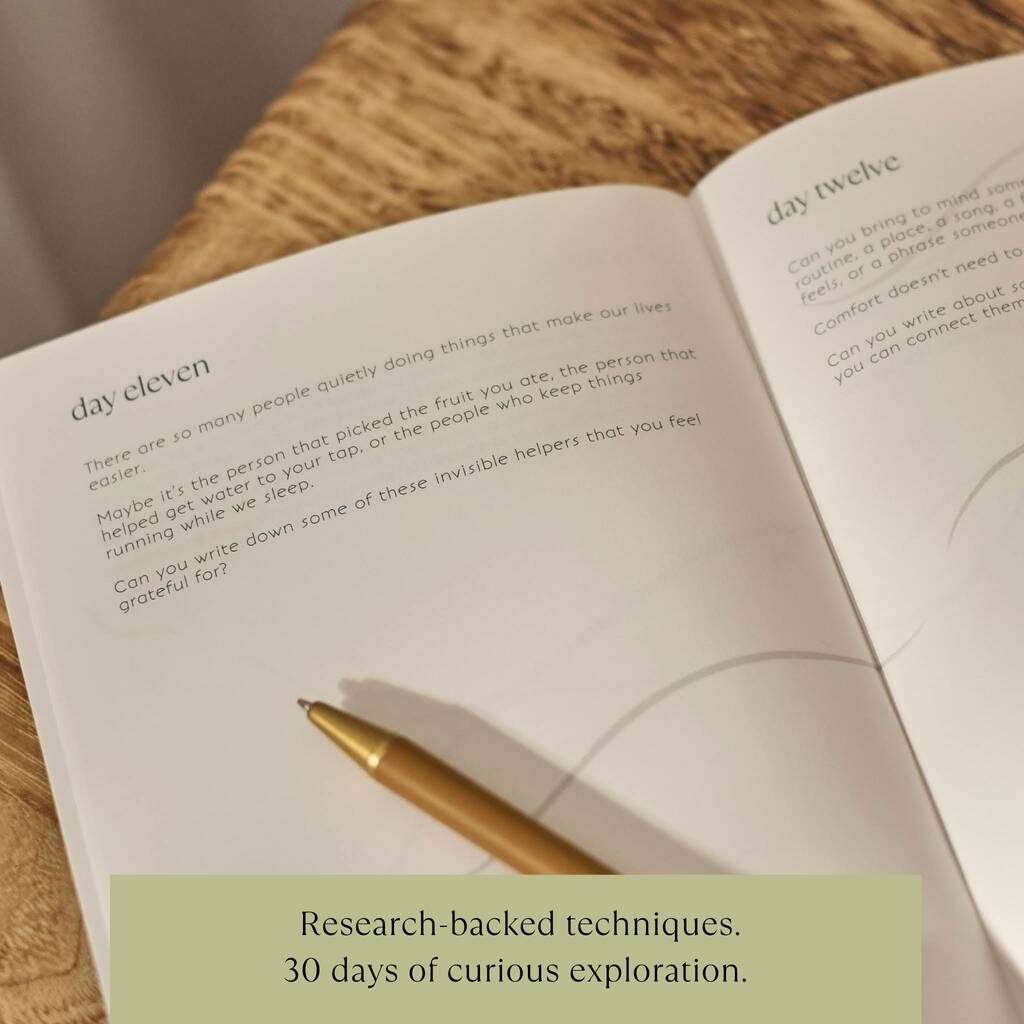 This isn't about numbered lists or 'perfect' grateful thoughts. It's about permission to be human, research-backed techniques that actually work, and 30-days of curious exploration.