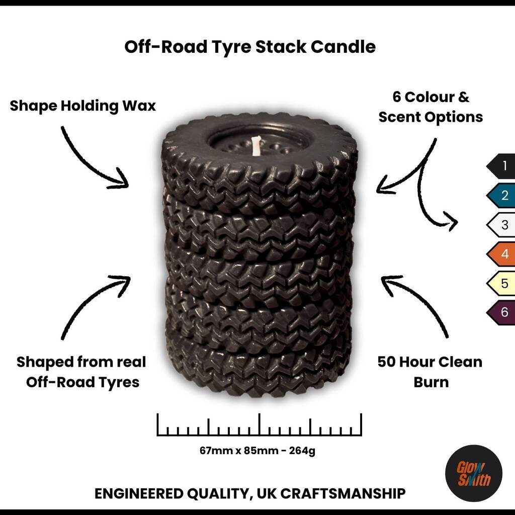 Satisfy your love for adventure and decorate your home with the Tyre stack candle. Its unique, rugged design features a stack of off-roading tyres, adding a touch of the outdoors inside your home. Expertly moulded from a stack of 4x4 Land Rover tyres, this candle will be a statement peice in any setting around the home.