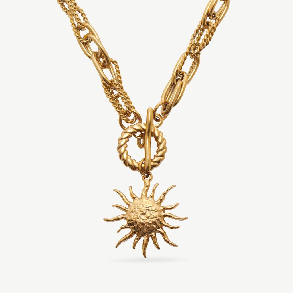 Handmade with a multi link & textured gold chain, featuring a hammered sun pendant. Finished with a toggle clasp to add dimension.