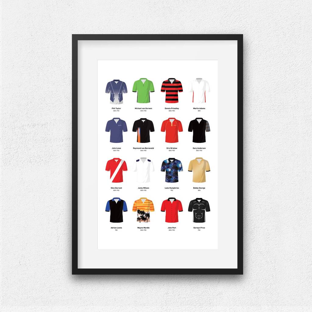 A print showcasing the most iconic shirts worn by your favourite dart players during their most memorable games.