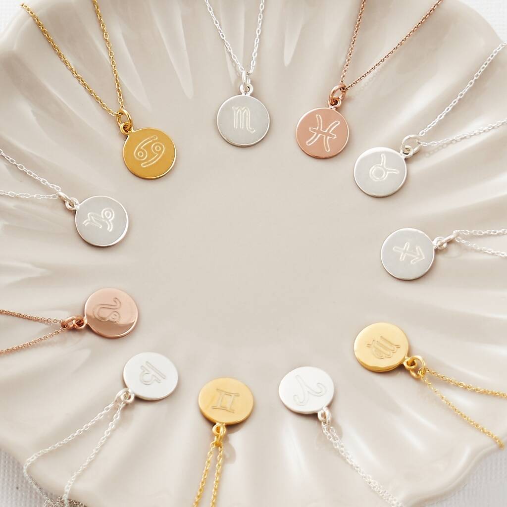 Zodiac sterling silver starsign necklace, engraved with the symbols of horoscope signs. A meaningful piece of astrology jewellery, celebrating personality, identity & the stars.