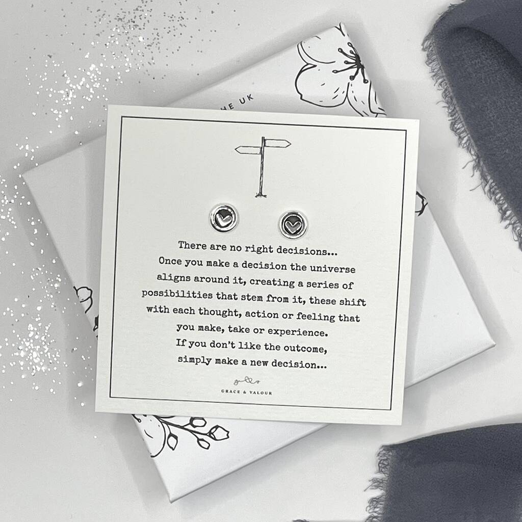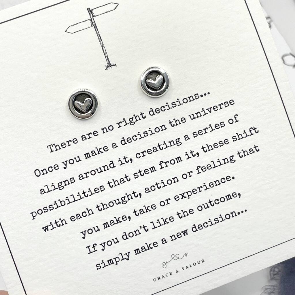 A stylish pair of Sterling Silver love heart stud earrings on my bespoke Decision Making Poem gift card.