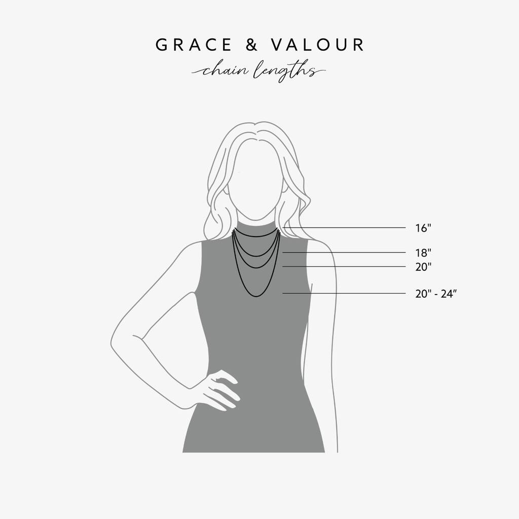 The necklace & gift card will arrive beautifully presented in our signature Grace and Valour flower envelope jewellery gift box.