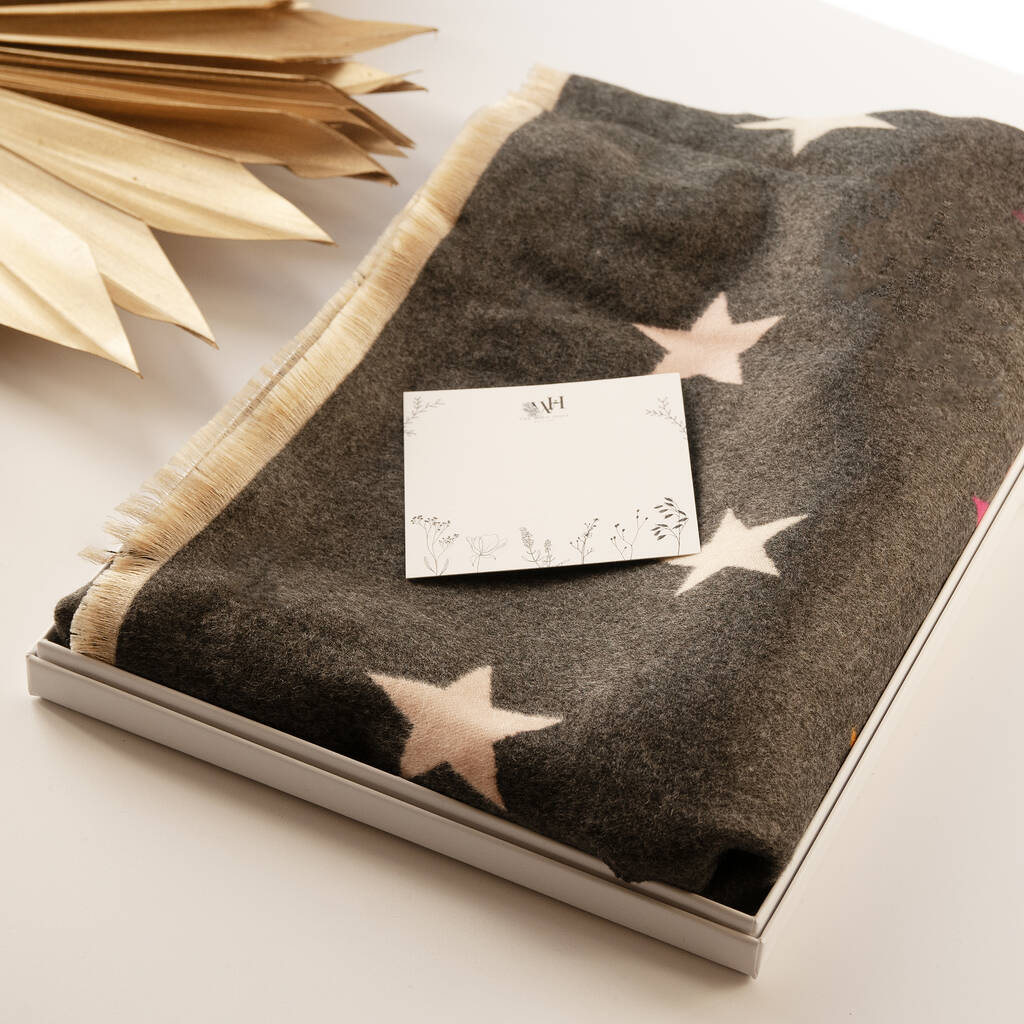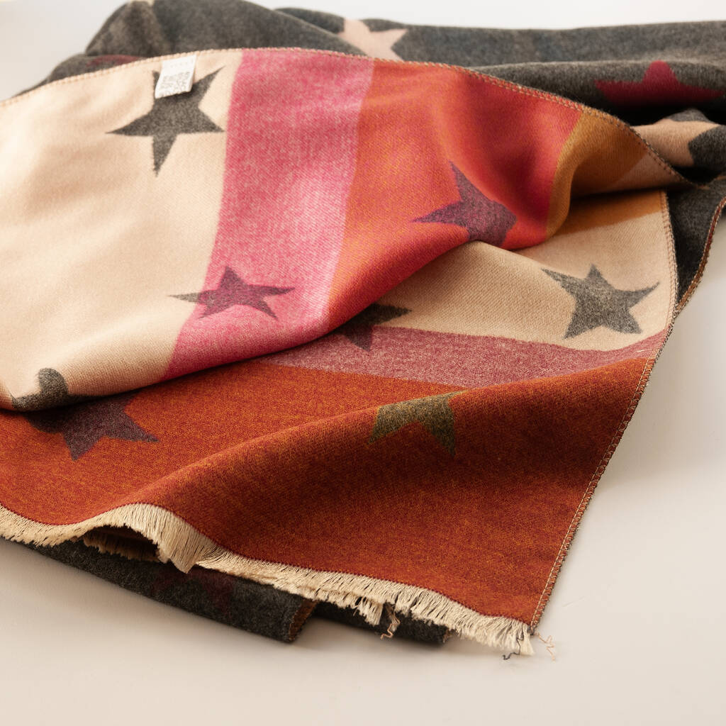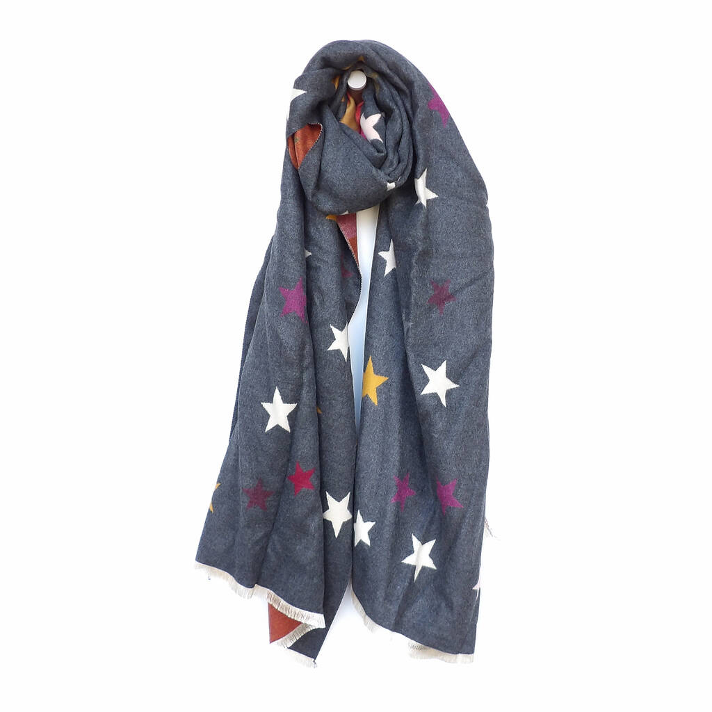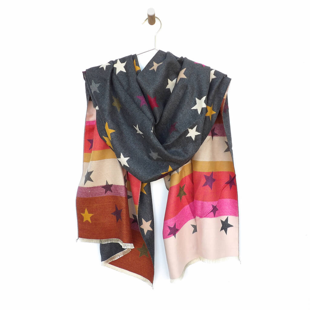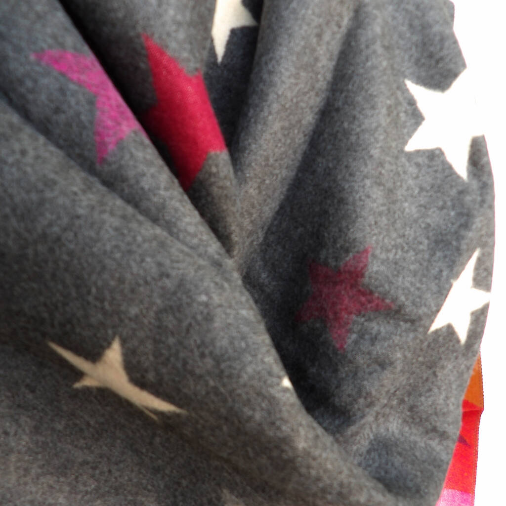 Our super snuggly colourful and reversible star winter scarf can be worn around the shoulders as a shawl or wrap.