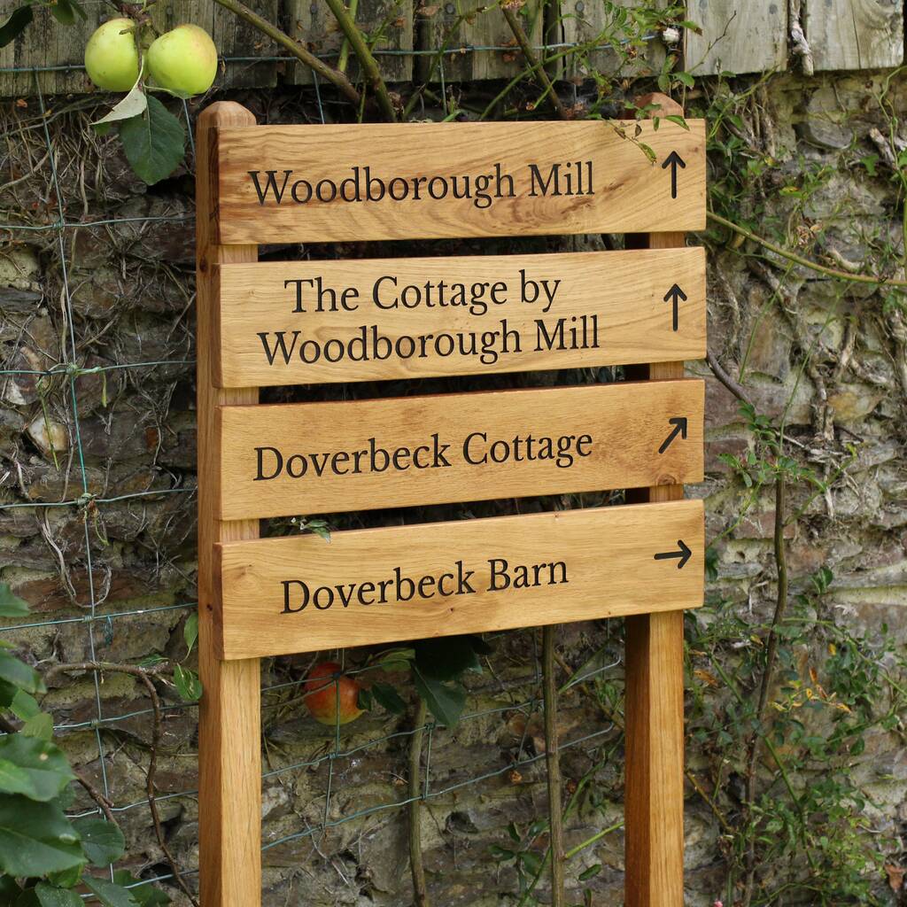 Our beautiful signposts are handmade in Devon from locally sourced oak on Dartmoor national park. The oak is specifically selected to have knots and naturally vibrant grain which is then enhanced with a special UV protective oil. The legs are solid oak as well which will last years in the ground without any added chemicals.
