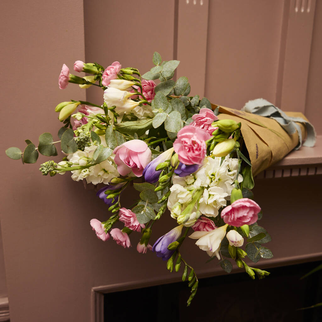 An ode to the Isle of Guernsey. A graceful symphony of gentle fragrance and soft colour. Featuring fragrant freesia in shades of while, lilac and blush, pink roses, spray carnations, fluffy white stocks and pom pom chrysanthemums, this bouquet is both timeless and contemporary perfect for marking meaningful moments with grace and beauty. Ideal for birthdays, thank you, new home or just because moments. Vase not included.