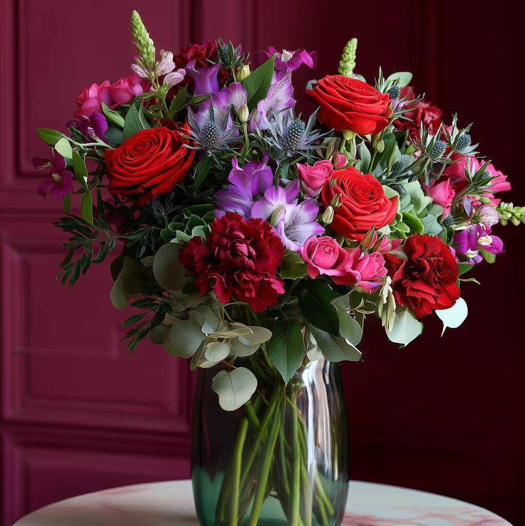 A dramatic, romantic bouquet. Rich in texture and colour, this bouquet is perfect for those who adore bold sumptuous blooms and the tension held between wild romance and elegant sophistication. Featuring red roses, burgundy carnations, purple alstroemeria with purple clematis, blue eryngium and fresh lush foliage. Raw and captivating, this is an exquisite choice for romantic occasions, celebrations, or any moment where only bold beauty will suffice. Vase not included.