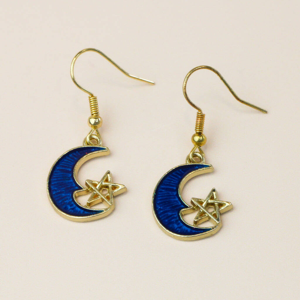 Gold And Blue Crescent Moon And Star Dangle Earrings