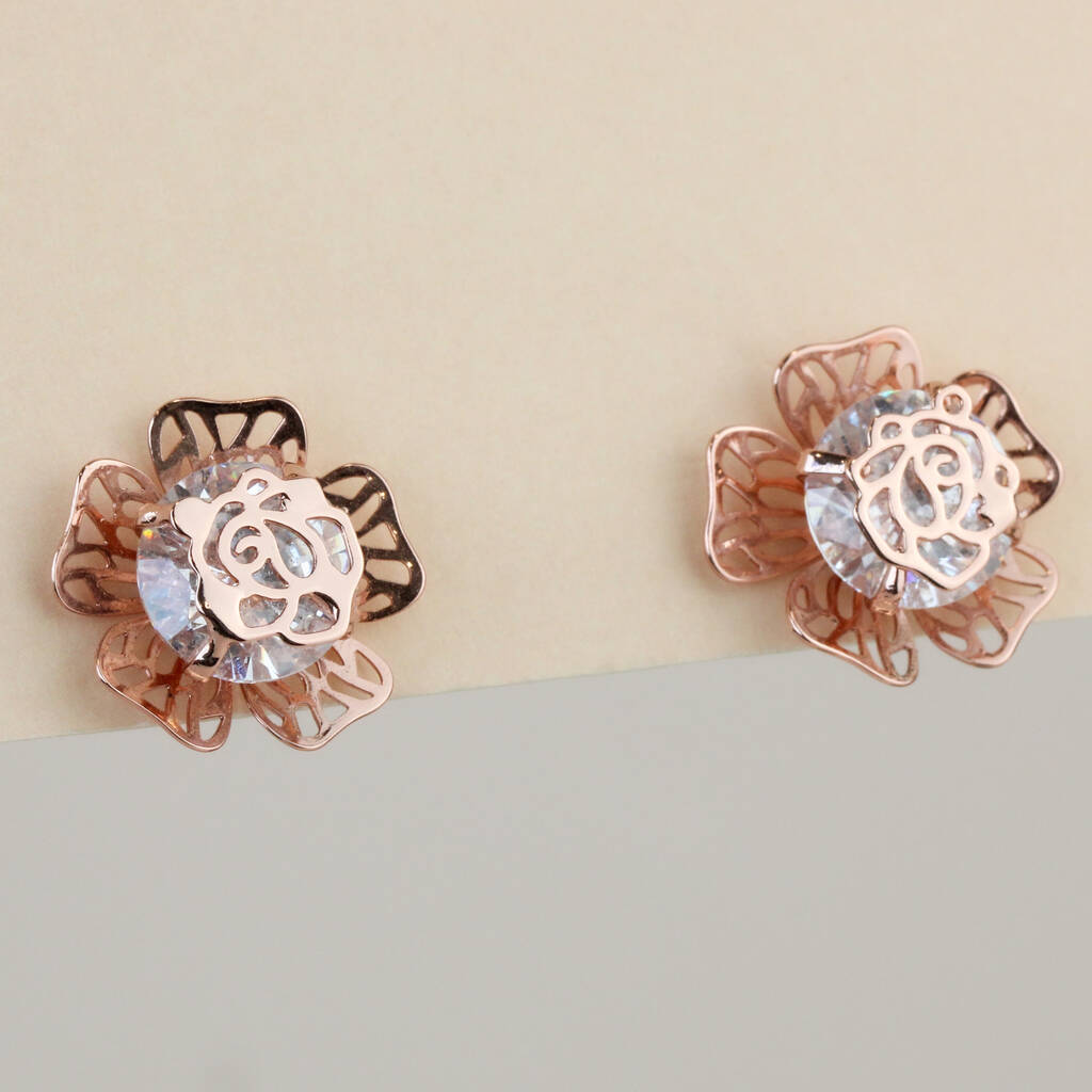 Rose Flower Stud Earrings With Shiny White Crystal Gift For Her