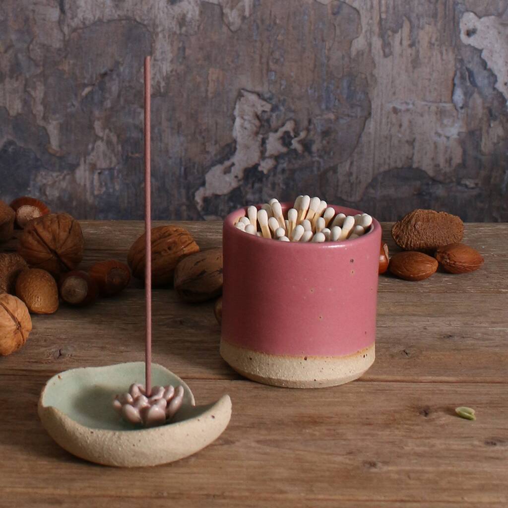 You have a choice between a pot on its own, a pot of 50 matches or a pot of 100 matches and one striker pad on the base. The pot can hold up to 100 matches. The striker pad will wear out over time, but no need to worry, we sell replacement matches and additional strike pads from our website habulous.co.uk. As each pot is made by hand, yours may vary slightly from those shown in the images.