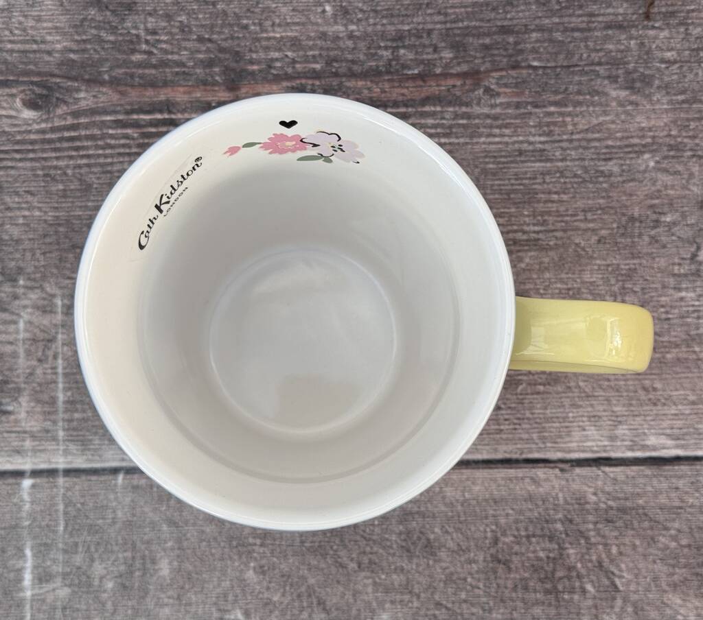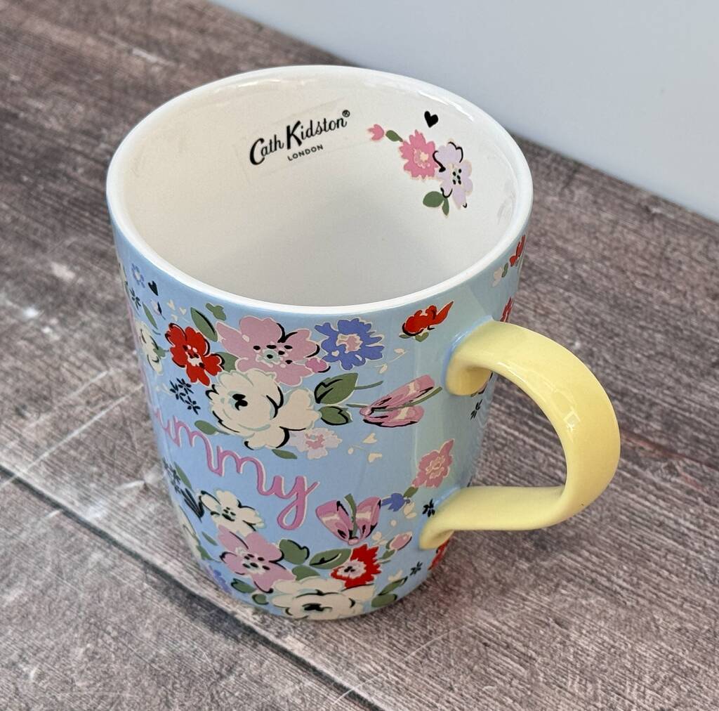 A blue mug with a floral pattern and 'mummy' written on one side.