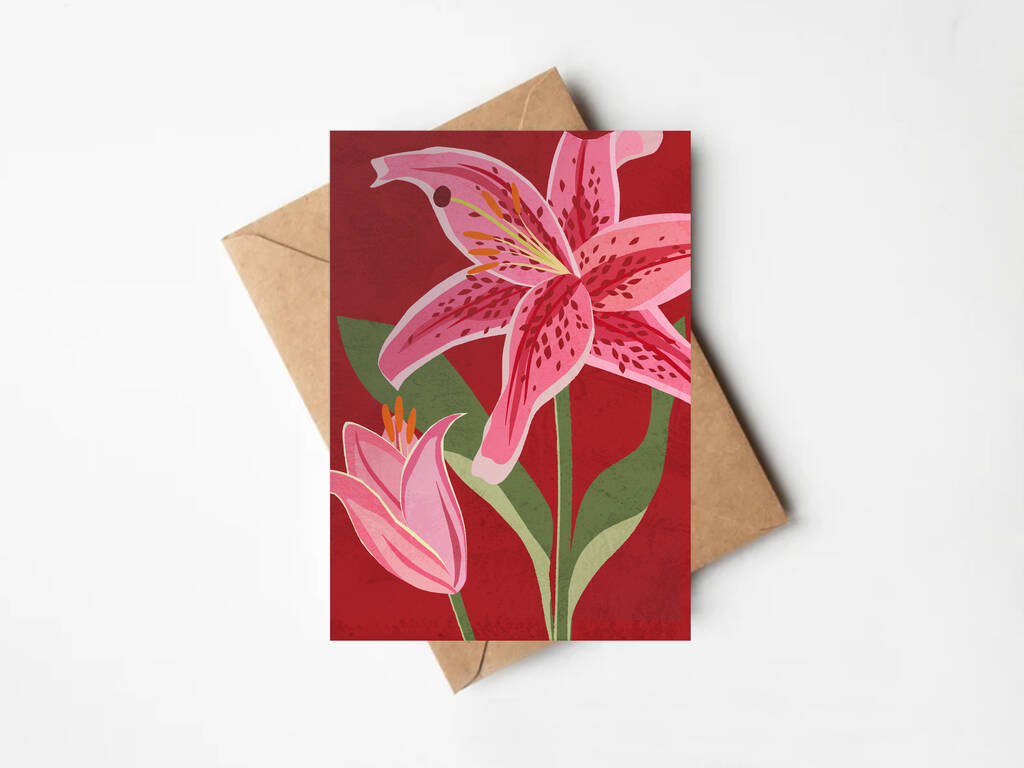 Stargazer Lily Greeting Card, Botanical Illustration, Pinks And Reds, All Occasion, In Sympathy, Mothers Day, Mum, For Her, Valentines