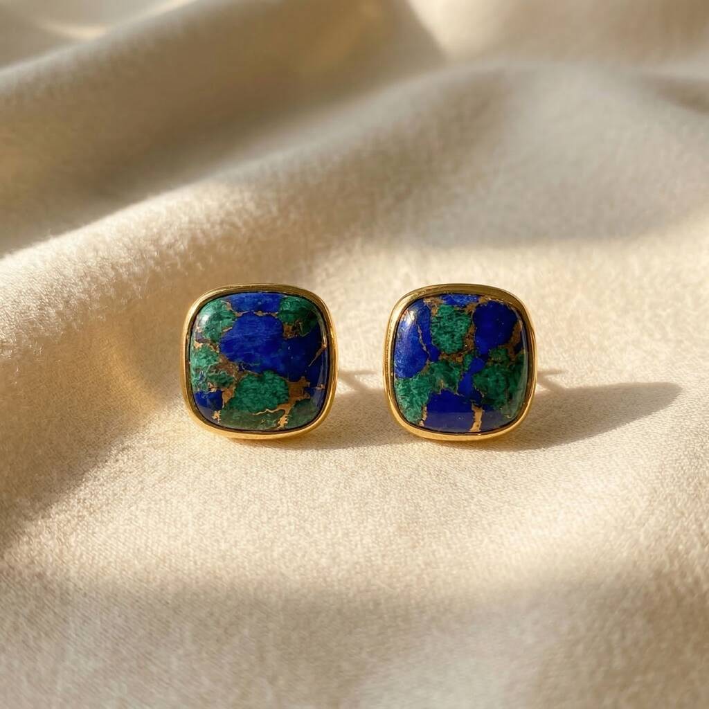 These earrings feature natural azurite and malachite gemstones set in gold plated settings with a polished finish. To care for your jewellery, store the earrings in a dry place when not in use and avoid contact with perfumes, lotions, and harsh chemicals. Remove before swimming, showering, or exercising, and gently clean with a soft jewellery cloth to maintain their shine.
