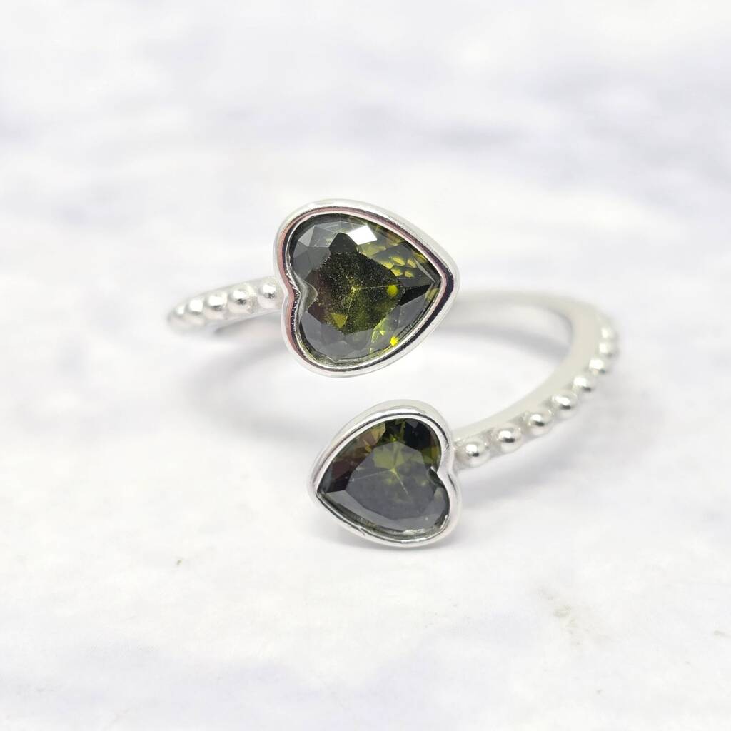 A vibrant sterling silver double-heart ring featuring August’s peridot birthstone.Symbolising growth, joy, and prosperity, this adjustable ring is perfect for expressing affection. The peridot accent adds a playful pop of colour to a delicate design. Arrives in luxury gift packaging, making it a memorable birthday or keepsake gift.