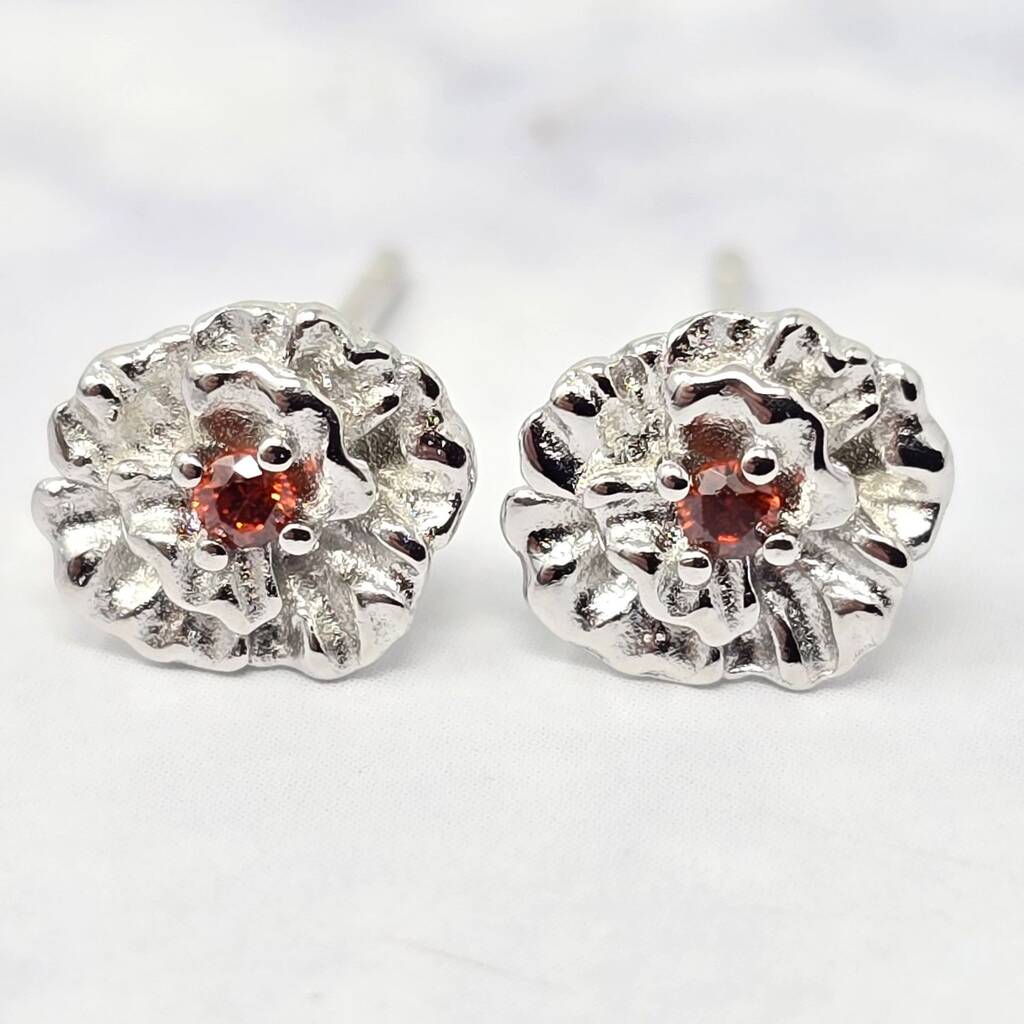 Sterling silver carnation stud earrings with January’s garnet birthstone, perfect for birthdays, meaningful gifting, or adding refined elegance to any outfit.Carnations symbolise love and fascination, making these birthstone studs a meaningful and stylish accessory. The garnet adds rich colour and sophistication. Delivered in luxury gift packaging, ready for gifting to someone special.